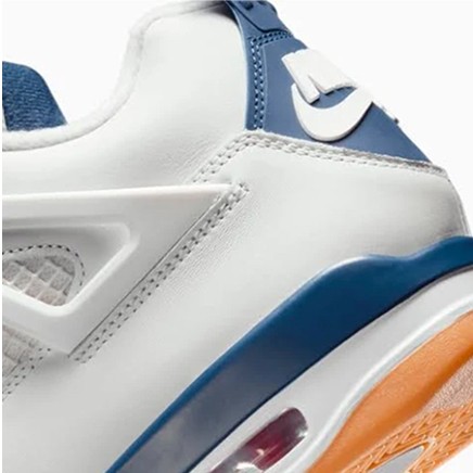 The Air Jordan 4 Retro SB Navy reinvents the 1989 Tinker Hatfield classic with skate-ready details and a crisp navy-and-white palette. Smooth white leather forms the upper with airy white mesh quarter panels and tongue, a soft grey suede mudguard, and navy plastic wing eyelets and heel tab bearing Nike SB branding. A red Jumpman marks the padded leather tongue. The rounded toe box, supportive heel counter and lace cage deliver lockdown; a visible Air unit in the midsole provides signature cushioning while a durable gum rubber outsole offers reliable grip. Ideal for streetwear or skate sessions, it pairs cleanly with denim, joggers or casual tailoring.